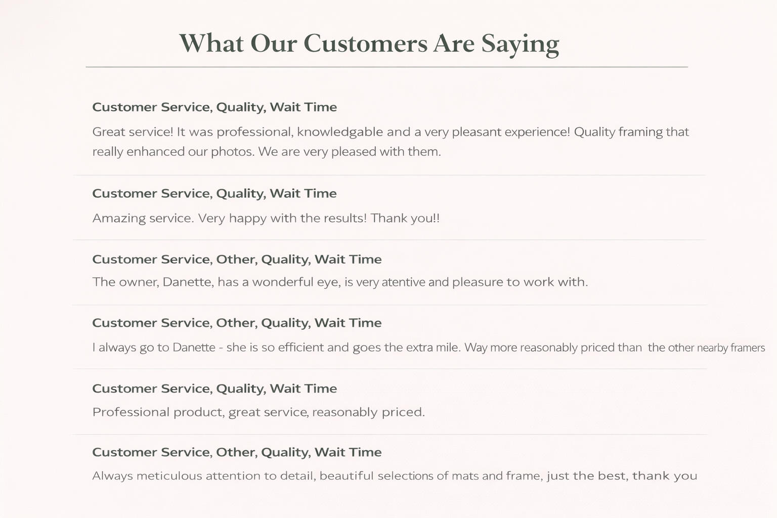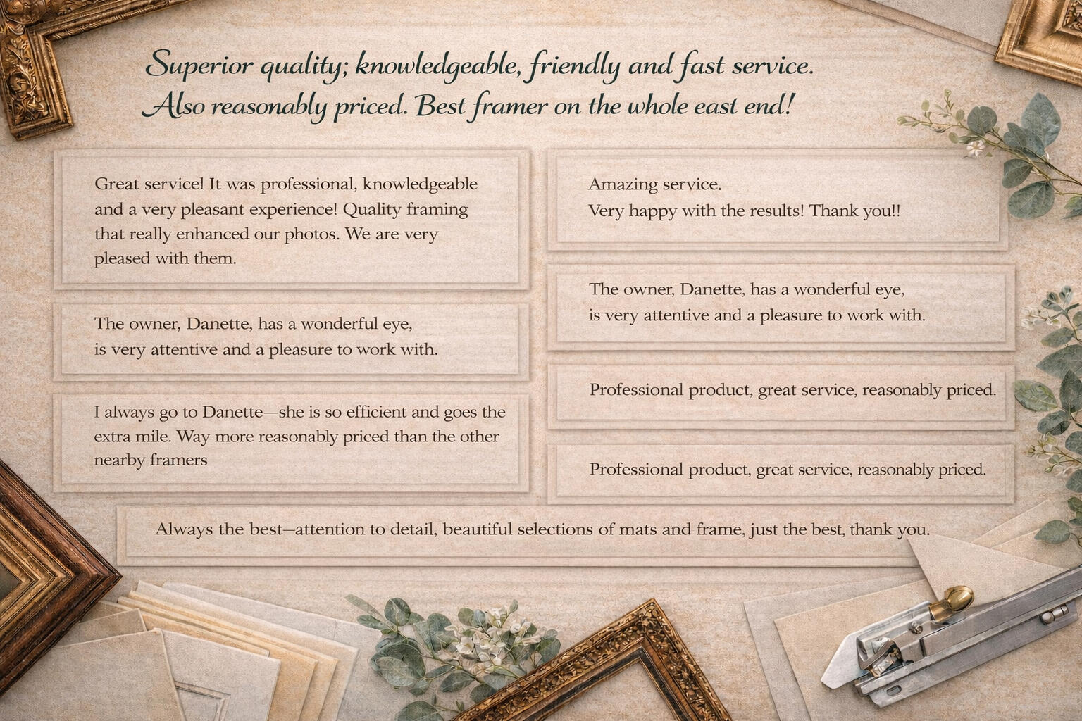 LOCATED IN THE HEART OF MONTAUK, OUR FAMILY OWNED FRAME SHOP HAS BEEN PROUDLY SERVING THE EAST END FOR OVER 30 YEARS. WE SPECIALIZE IN CUSTOM FRAMING, HELPING YOU PRESERVE AND SHOWCASE YOUR FAVORITE MEMORIES, ARTWORK AND KEEPSAKES WITH CARE AND CRAFTSMANSHIP. WHETHER YOU’RE A LOCAL ARTIST, A WEEKEND VISITOR, OR DECORATING YOUR HOME, WE OFFER PERSONALIZED SERVICE, HIGH QUALITY MATERIALS, AND A PASSION FOR DETAIL THAT SETS US APART.